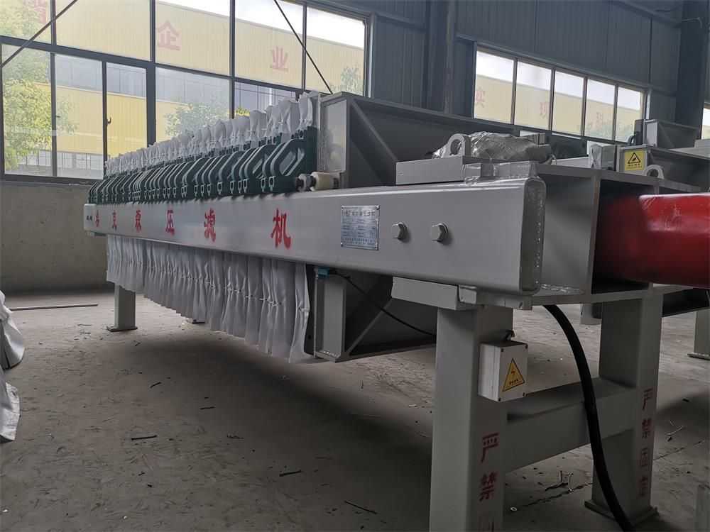 液壓廂式壓濾機由交替排列的濾板和濾框構成一組濾室。濾板的表面有溝槽,其凸出部位用以支撐濾布。濾框和濾板的邊角上有通孔,組裝后構成完整的通道,能通入懸浮液、洗滌水和引出濾液。板、框兩側各有把手支托在橫梁上,由壓緊裝置壓緊板、框。板、框之間的濾布起密封墊片的作用。由供料泵將懸浮液壓入濾室 在濾布上形成濾渣,直至充滿濾室。濾液穿過濾布并沿濾板溝槽流至板框邊角通道,集中排出。過濾完畢,可通入清洗滌水洗滌濾渣。